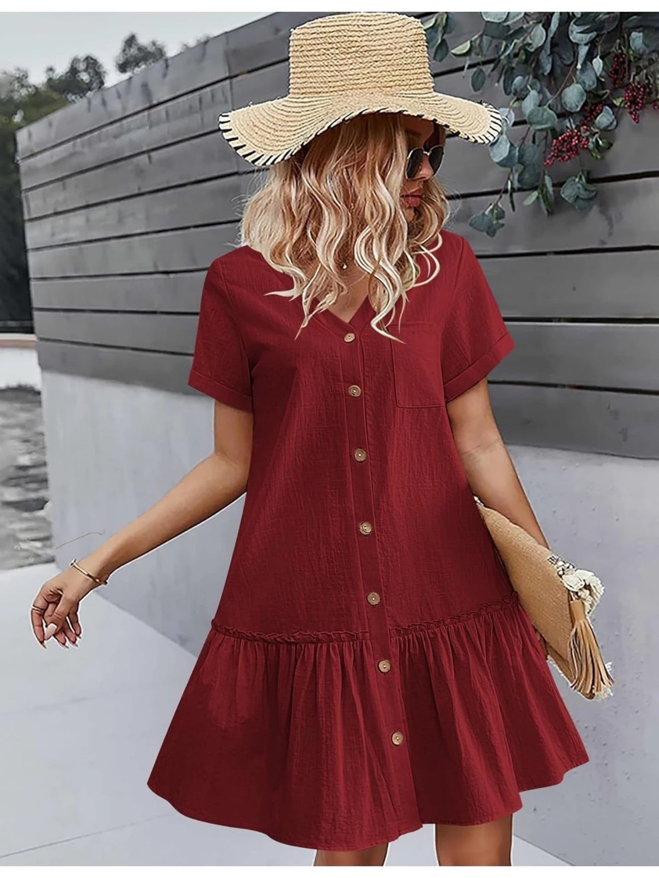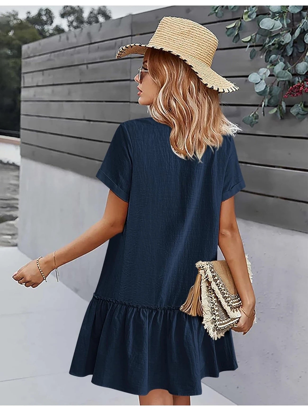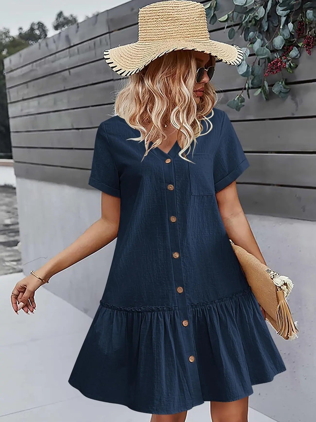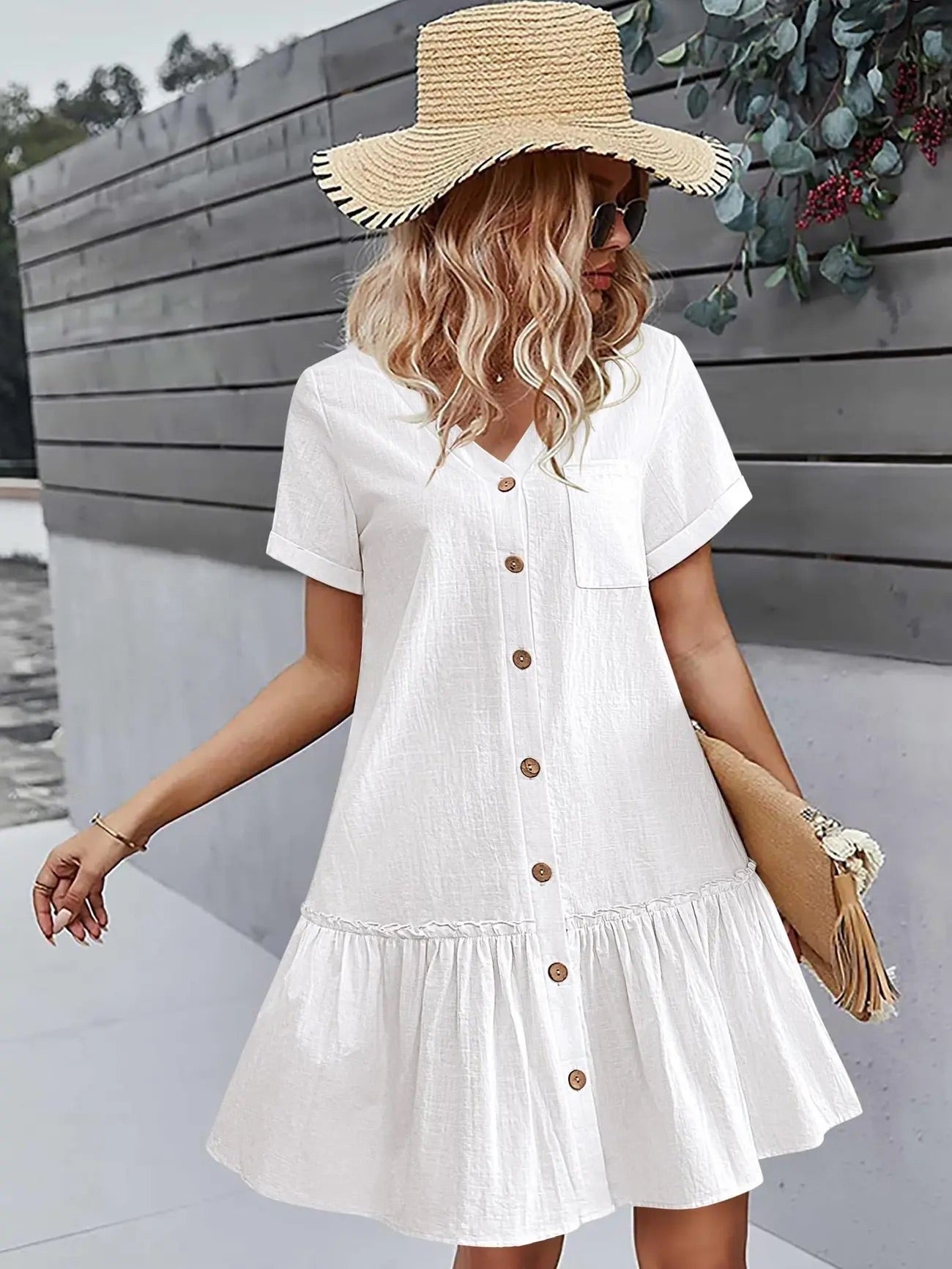 Discover effortless style and everyday comfort with our Button Front Ruffle Dress. Designed in a flattering relaxed tunic fit, this casual short sleeve dress features a classic button-down front and feminine ruffle detail that adds charm to every step.