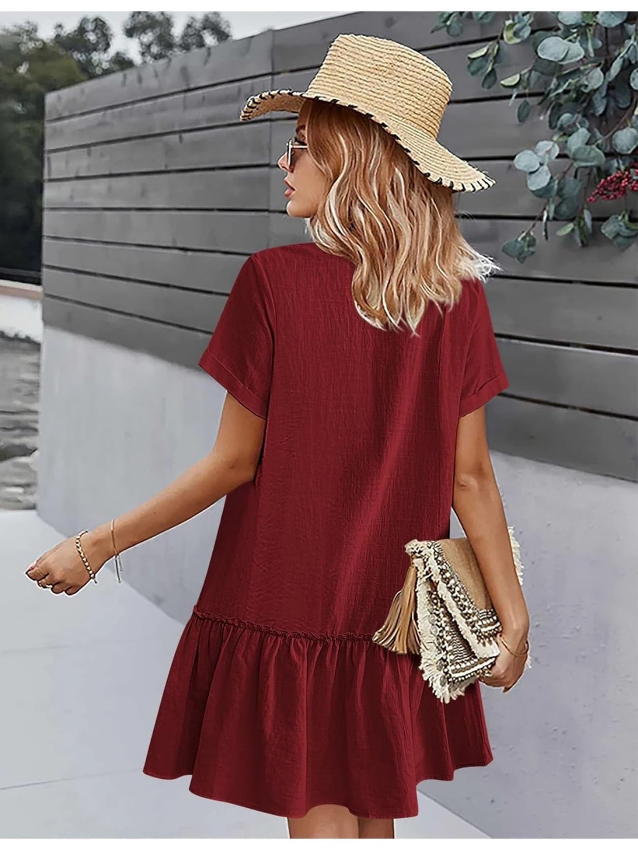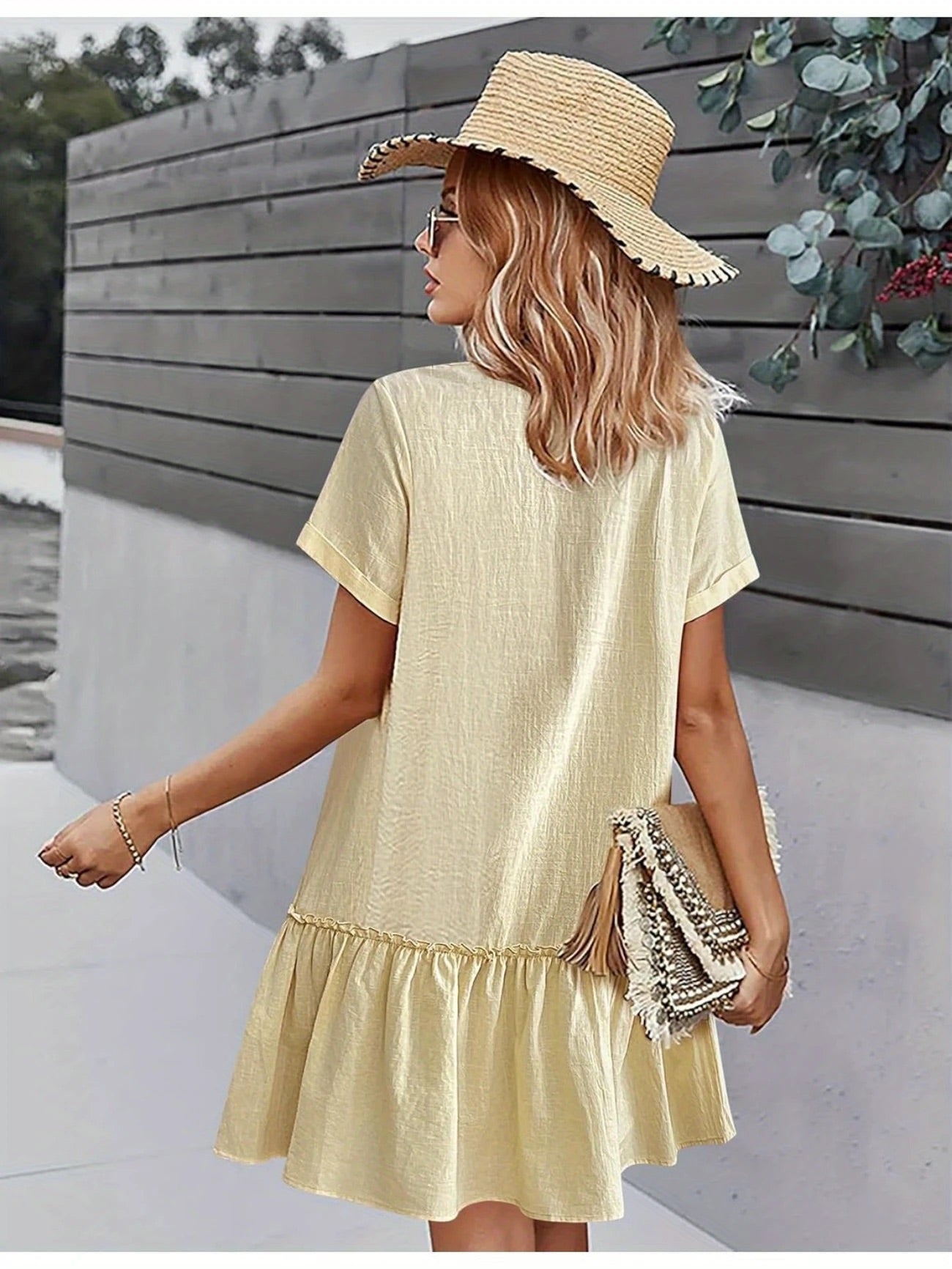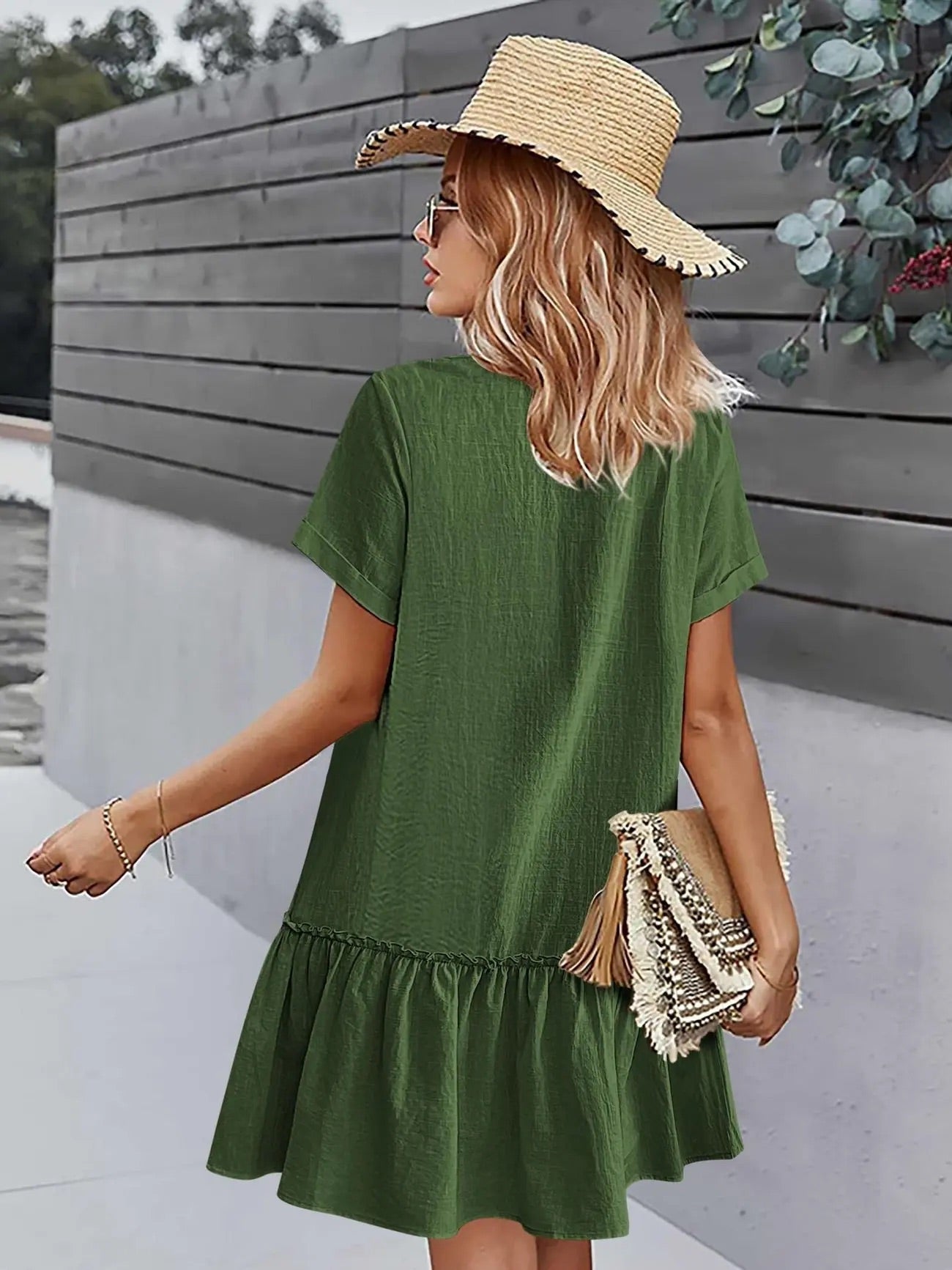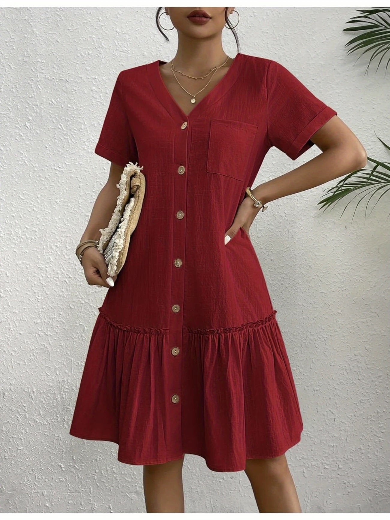 Discover effortless style and everyday comfort with our Button Front Ruffle Dress. Designed in a flattering relaxed tunic fit, this casual short sleeve dress features a classic button-down front and feminine ruffle detail that adds charm to every step.