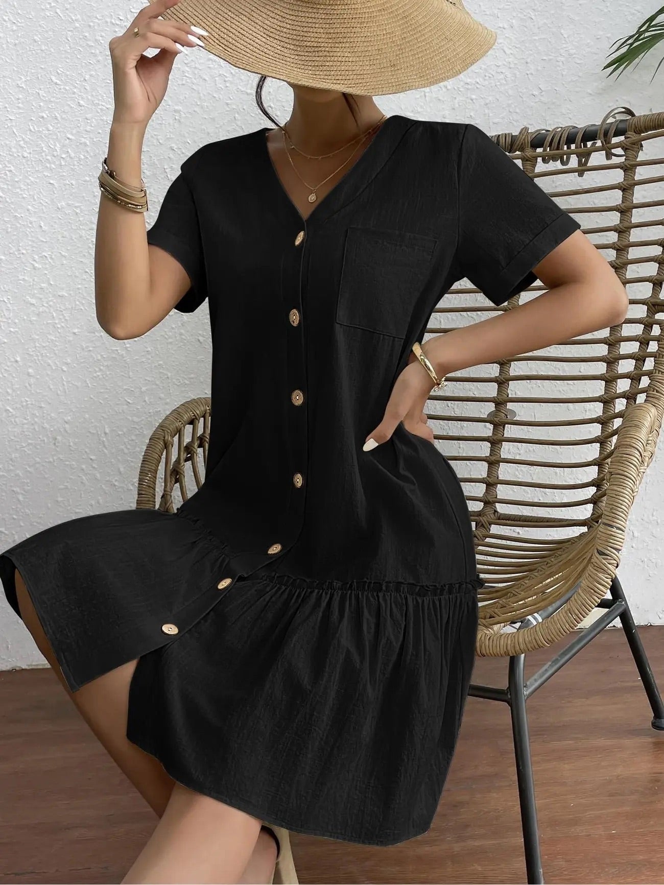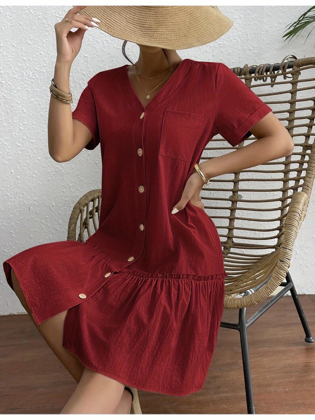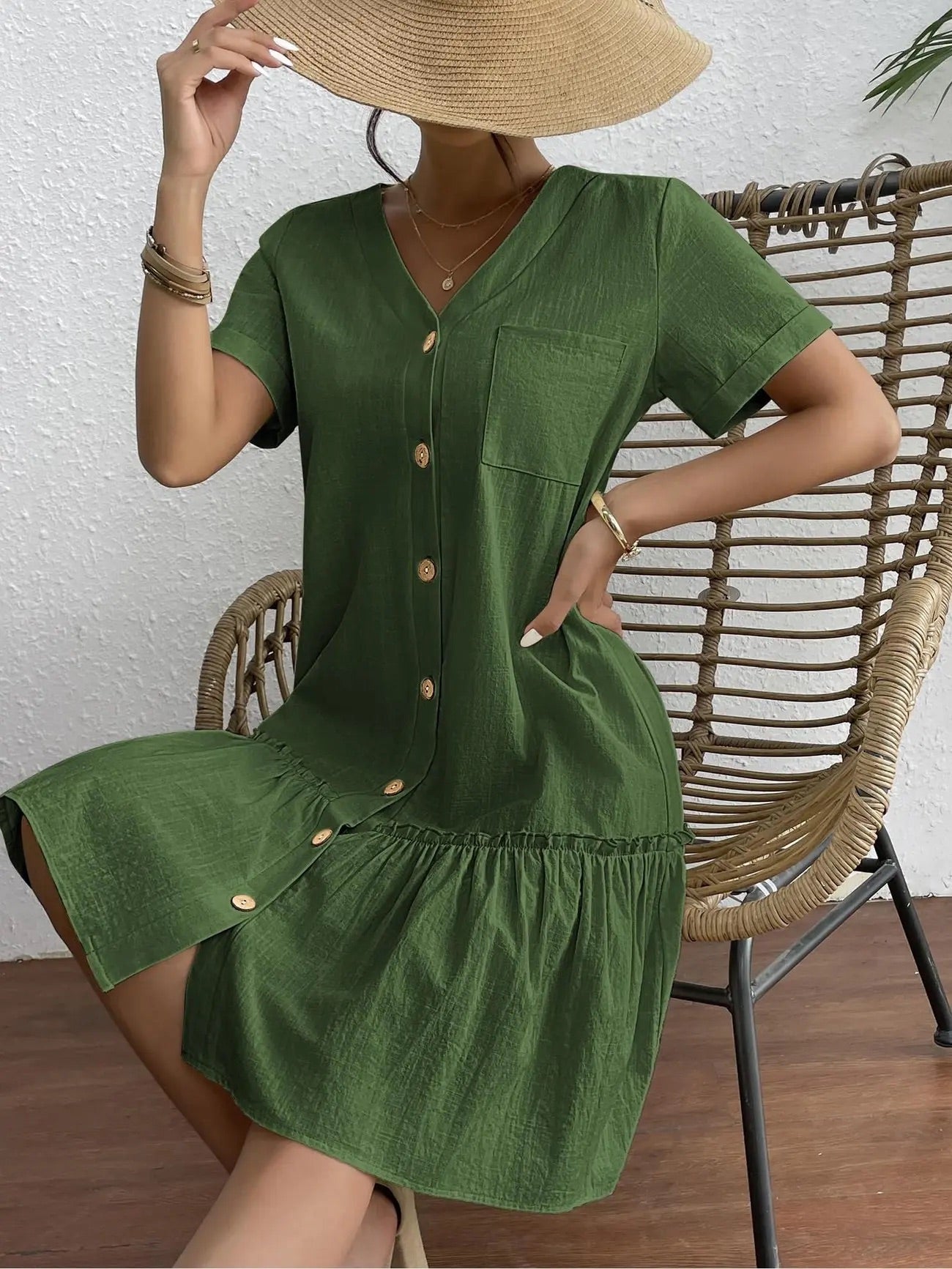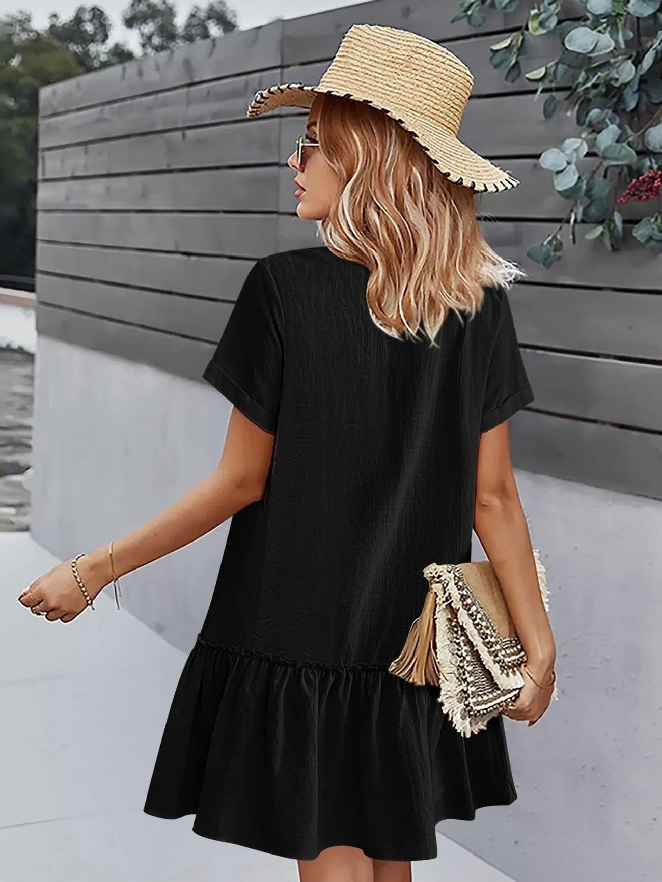 Discover effortless style and everyday comfort with our Button Front Ruffle Dress. Designed in a flattering relaxed tunic fit, this casual short sleeve dress features a classic button-down front and feminine ruffle detail that adds charm to every step.